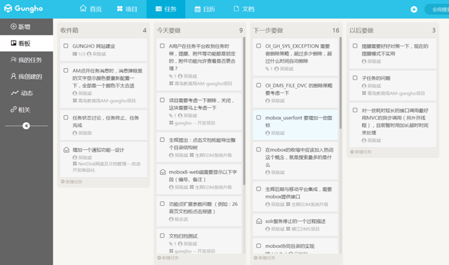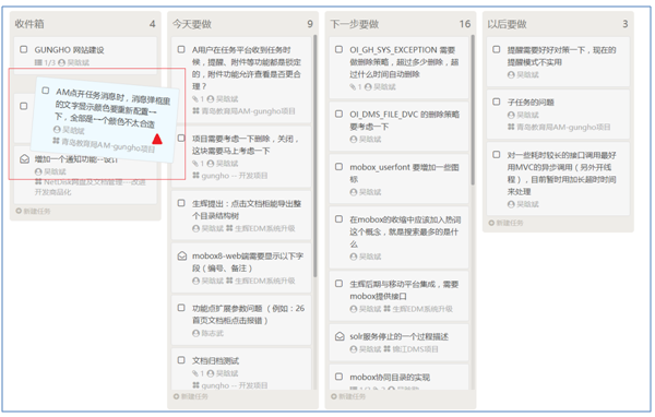 任務(wù)看板里出現(xiàn)的任務(wù)均是操作者需要處理的任務(wù),看板的目的在給這些要處理的任務(wù)簡(jiǎn)單做一個(gè)計(jì)劃,比如A任務(wù)今天做,B任務(wù)下一步做,C任務(wù)以后做,不需要你明確到具體日期只是做一個(gè)大概的規(guī)劃。因此在任務(wù)看板中我們看到的是4個(gè)泳道。
