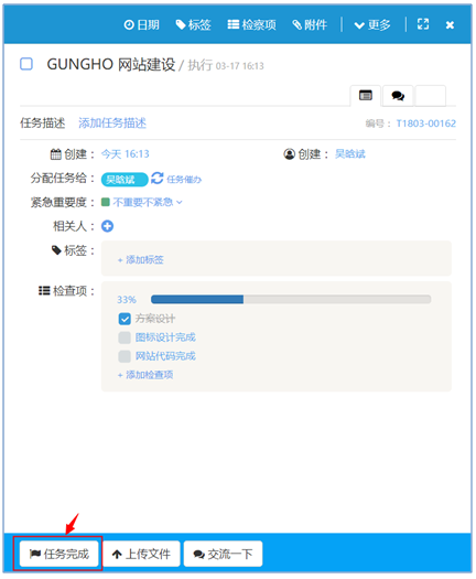 如果任務(wù)在創(chuàng)建時(shí)有設(shè)置過檢查點(diǎn),任務(wù)執(zhí)行人可以在任務(wù)顯示頁面中通過任務(wù)檢查點(diǎn)來設(shè)置任務(wù)進(jìn)度,如下圖紅色箭頭指處所示: