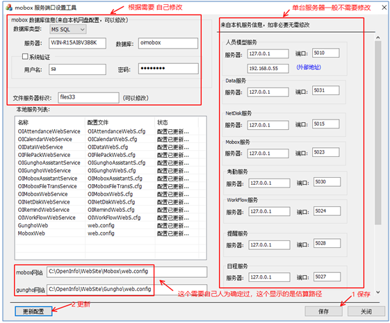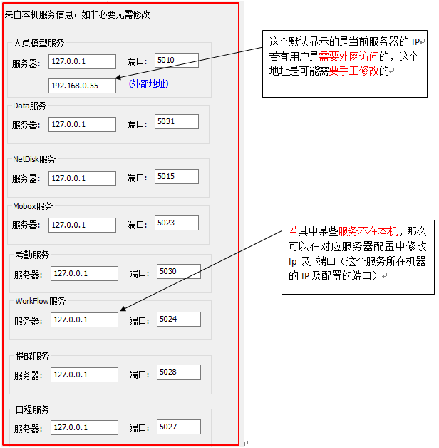 這個里面的數據來自對本機已經部署服務的信息獲取。一般這些是不需要修改的(除了人員服務的外部地址)。但若存在某些服務不在本機的情況,可以對該服務的IP及端口進行調整。調整會更新該服務涉及的所有相關配置