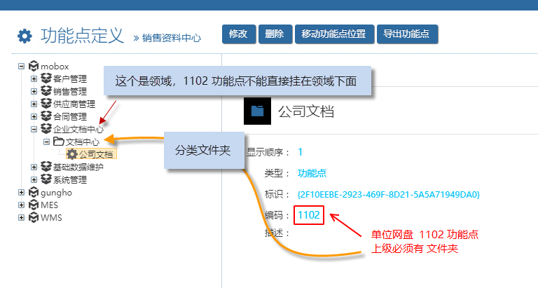 Mobox文檔中心定義 – 1101 及 1102 功能點 注意 2023/09/13 分類:產品中心 實施方案 714 mobox文檔中心可以掛接 1、單位網盤? ? ? ?(1102 功能點) 2、部門網盤? ? ? ?(1102 功能點) 在設置的Mobox文檔中心的時候,功能點不能直接掛到領域下面,而必須在領域下面先建立分類文件夾,之后才能掛接這2個功能點。 若直接掛到領域下面,會出現 而需要改成下圖發設置方法 標簽:方案 上一篇: 低代碼平臺關于數據對象定版后權限控制 下一篇: 關于Gungho及Mobox的授權(臨時授權部分)