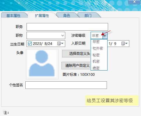 1、設(shè)置員工的涉密等級(jí) (超過自身涉密等級(jí)的文件,將不能正常訪問。如:瀏覽、下載等)