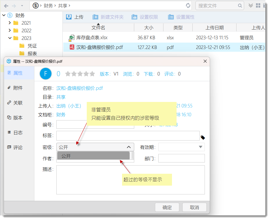 2、通過Mobox文件系統(tǒng)上傳的文件,管理員需要設(shè)置文件的涉密等級(jí)(所有等級(jí))。