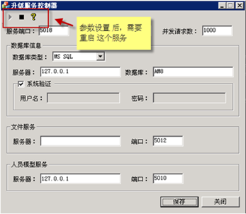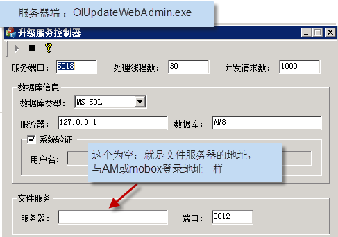 注解: 文件服務(wù)的服務(wù)器地址 (要求在局域網(wǎng)及外網(wǎng)都能訪問的IP地址)若有些用戶沒有外網(wǎng),則就是內(nèi)網(wǎng)能訪問的地址。 (一般我們的升級服務(wù)與AM8/Mobox的主服務(wù)都是在一臺機(jī)器上)參數(shù)更新后,需要重啟這個服務(wù)