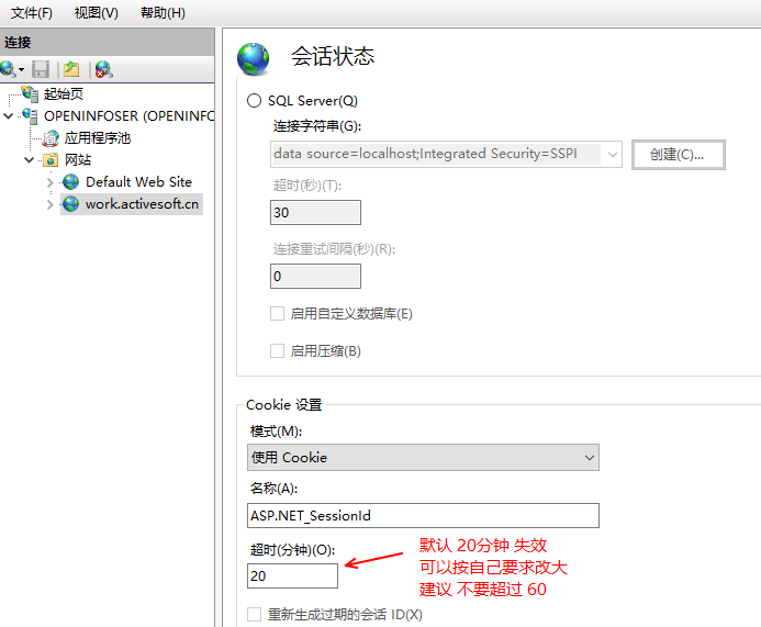 設置IIS的session (失效)過期時間(登陸后較長時間登錄有效) http://www.youxidaiyun.com/3155/ Mon, 20 Jan 2025 05:40:28 +0000 http://www.youxidaiyun.com/?p=3155 Mobox實施工程師希望,“mobox2一段時間不動,就需要刷新頁面,這個時間可以延長嗎,比如說頁面半個小時候沒人動,才需要刷新” 。這個需要設置設置下IIS的session 過期時間來實現