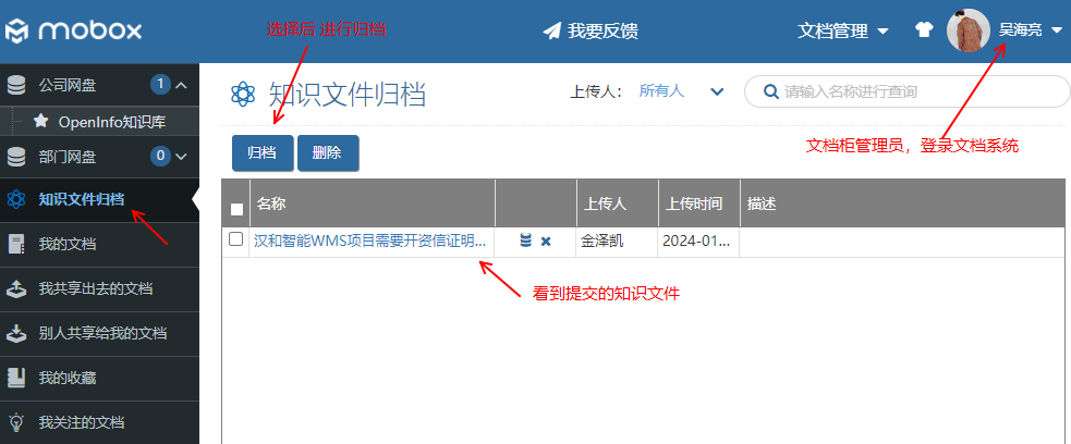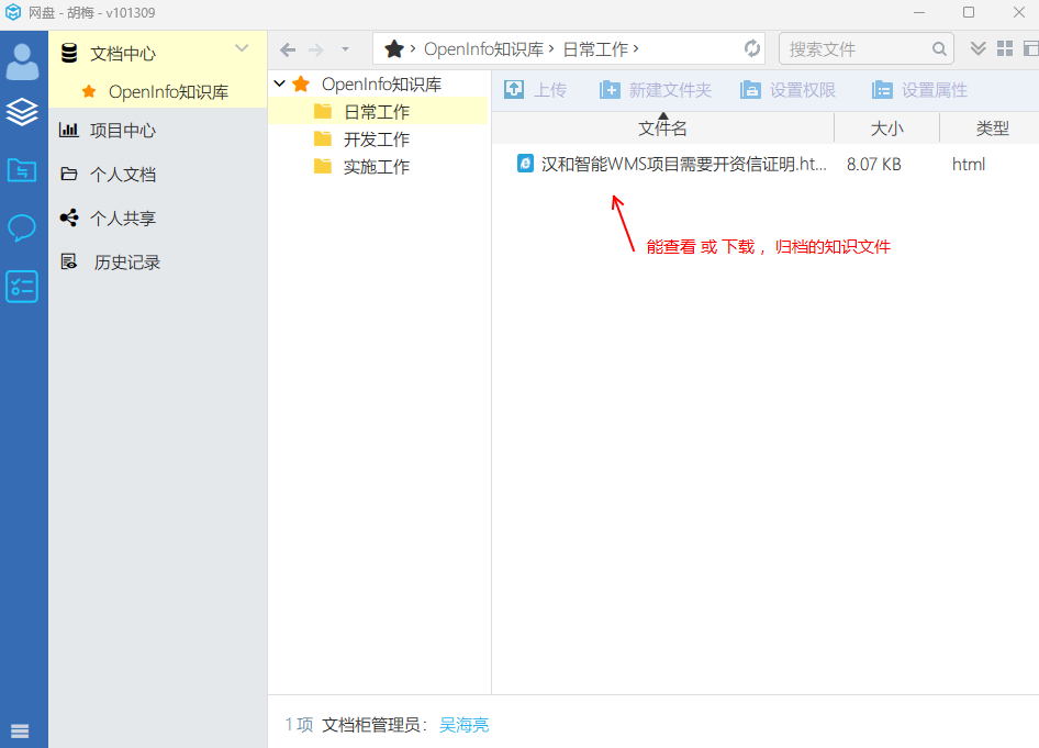 歸檔后,對文檔柜有權(quán)限的用戶就能通過文檔系統(tǒng)下載或?yàn)g覽這些知識文件