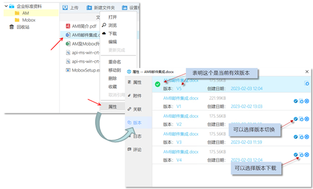 版本管理是一個非常重要的功能,在文檔中心及部門共享內(nèi),文檔柜里面同名文件多次上傳后會產(chǎn)生版本,可以設(shè)置哪個版本為有效版本 ,可以按需下載歷史版本